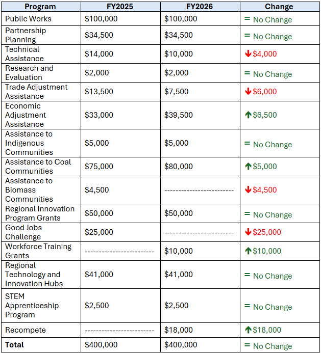 This appropriations package provides $466 million for the Economic Development Administration (EDA) in FY 2026, a modest $2 million reduction below FY 2025 levels. Given the previously submitted proposals for EDA funding in FY 2026, this is a strong reaffirmation of the agency’s role in regional economic development. Below are programmatic items whose funding levels changed for FY 2026 (in thousands of dollars): Â